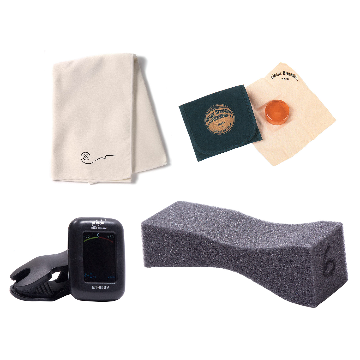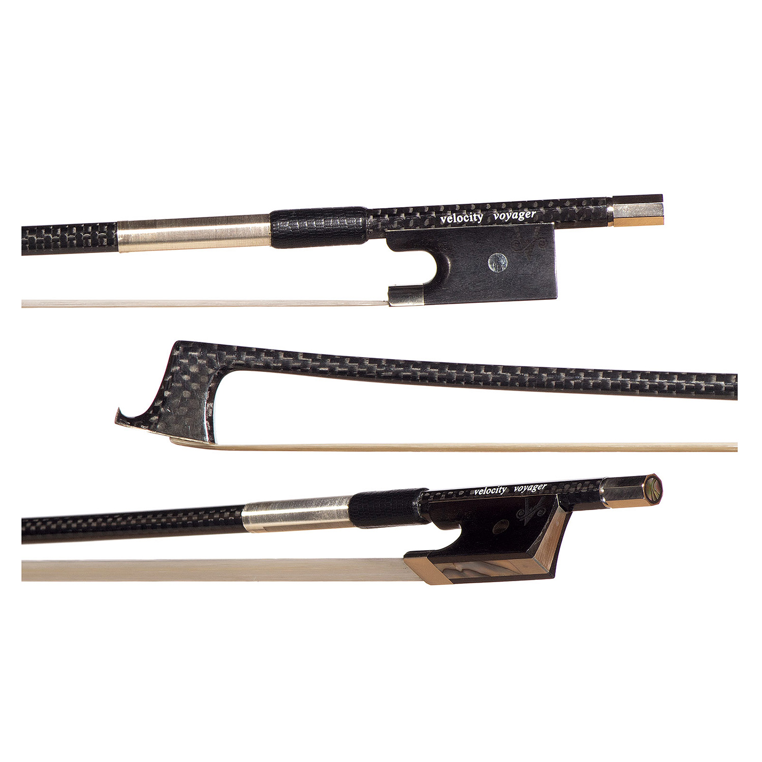 This outfit includes a Velocity Voyager bow, protective dart-shaped case, cleaning cloth, Bernardel rosin, an Eno tuner, and foam shoulder rest.