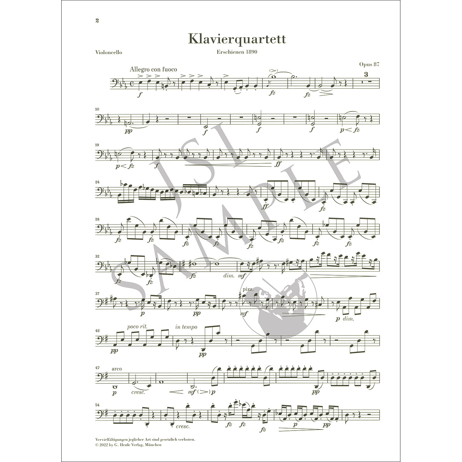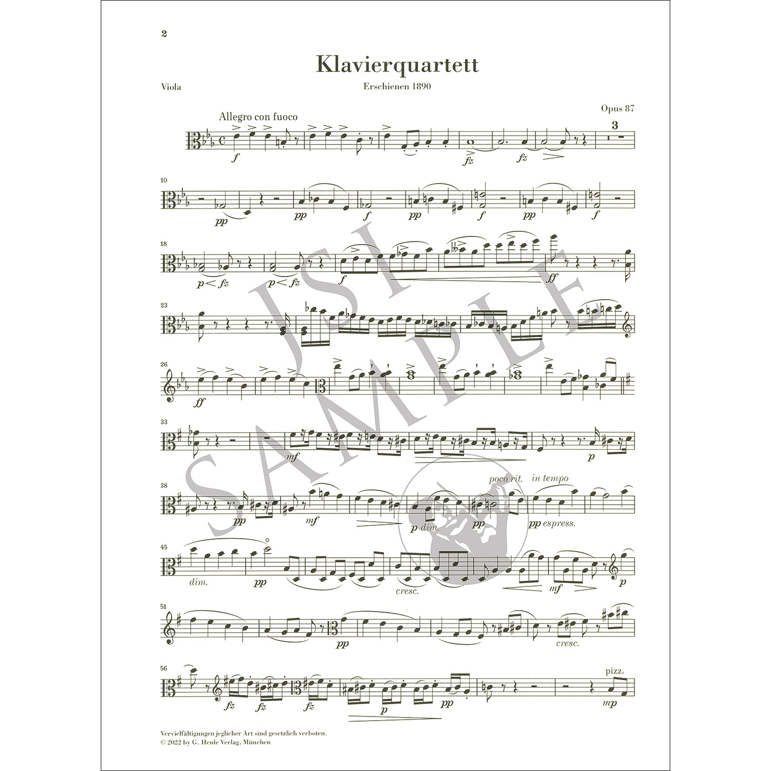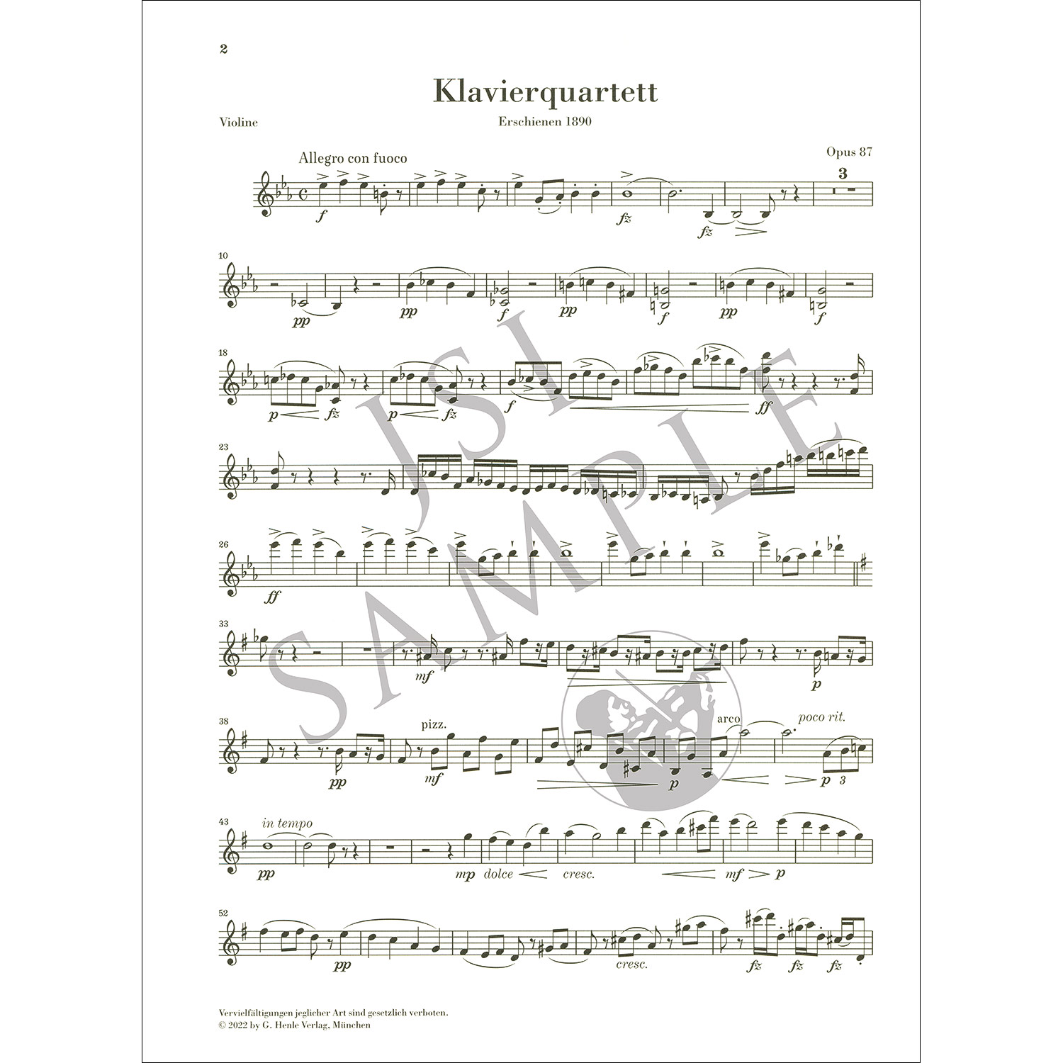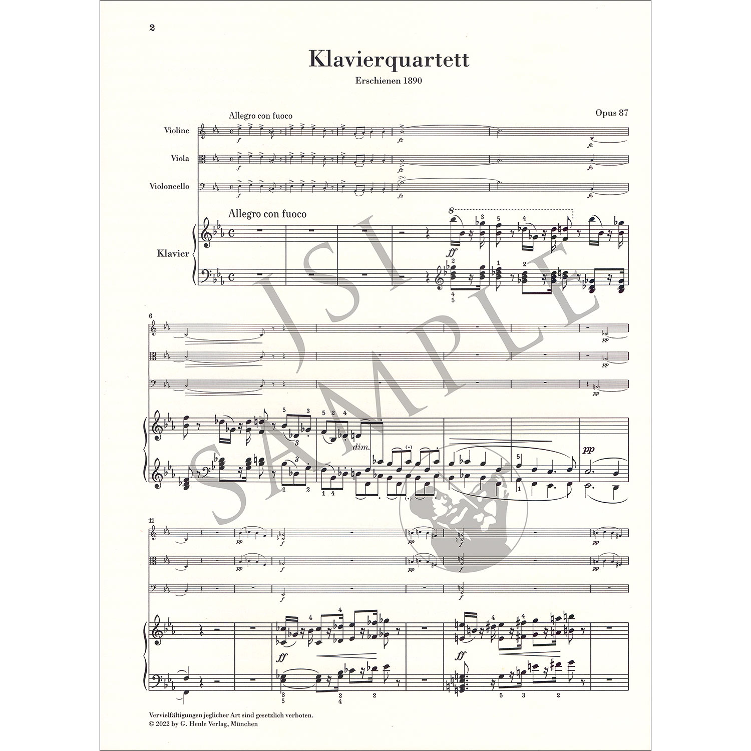 Piano Quartet in E-flat Major, Op.87, for violin, viola, cello, and piano; parts; Antonin Dvorak (Henle). edited by Peter Jost. HN1580