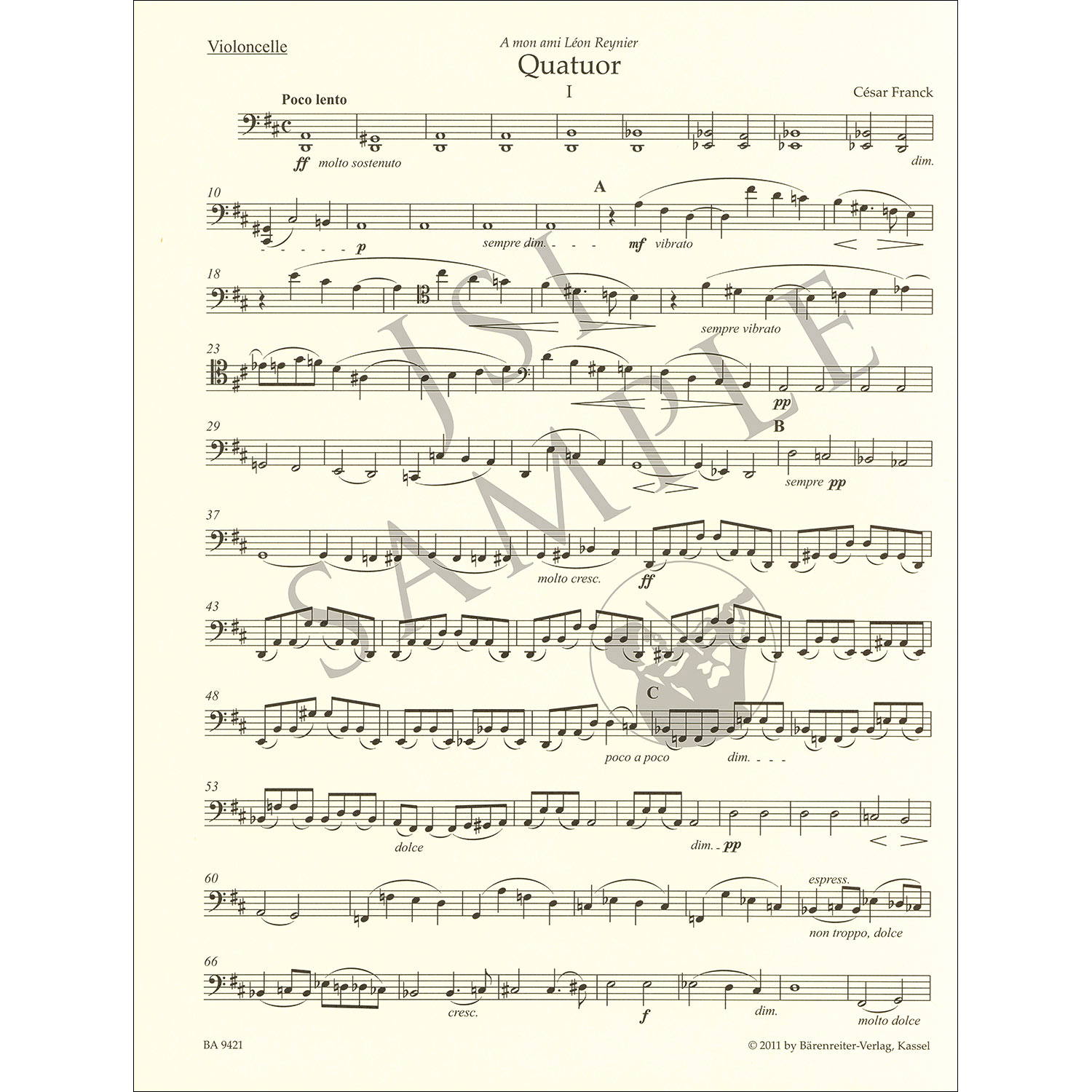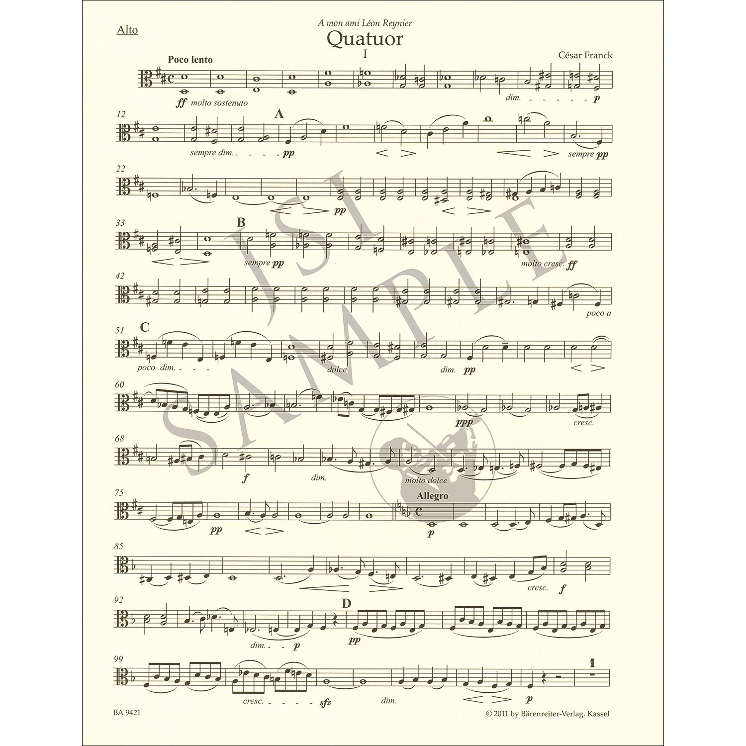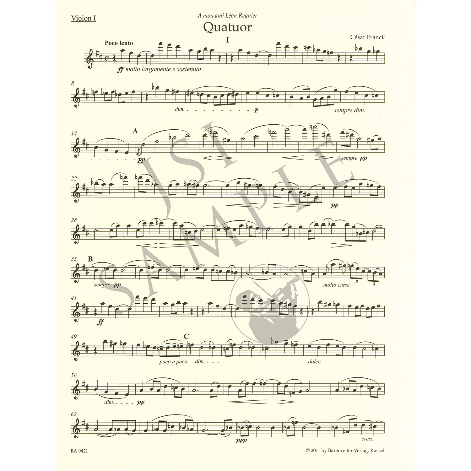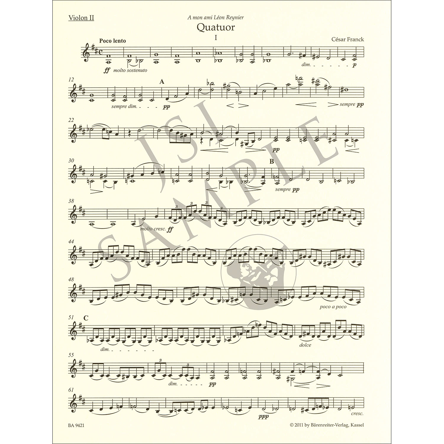 Franck's String Quartet in D Major (1890) was his final completed chamber work and one of his few public successes he enjoyed in his lifetime. His characteristic modulatory style and cyclic method of thematic development come together with Mendelssohnian textures and Beethovenian rigor and weight. It is a significant entry in French chamber music, fully symphonic in scope. This masterpiece is presented here in a Barenreiter urtext edition edited by Christiane Strucken-Paland. Parts only. Master level, grade 6.