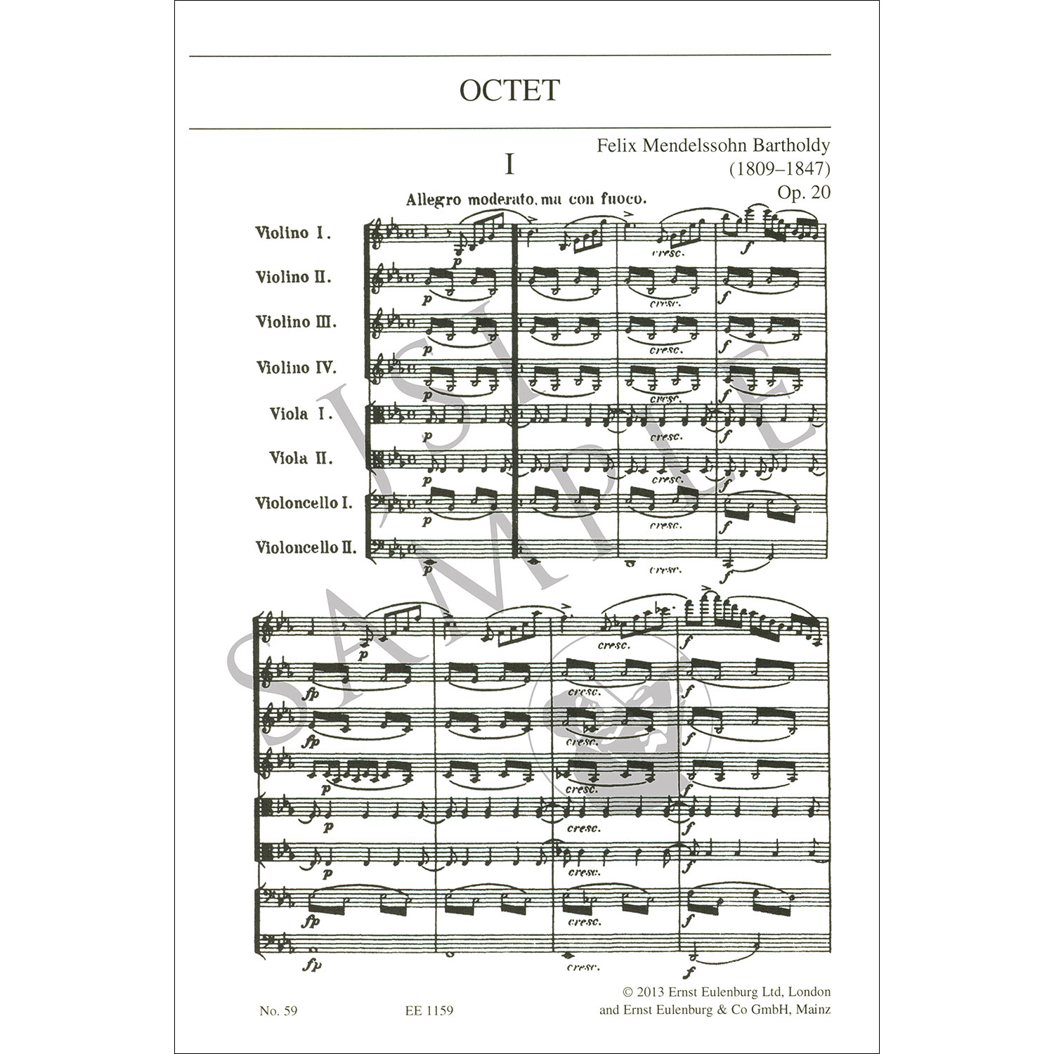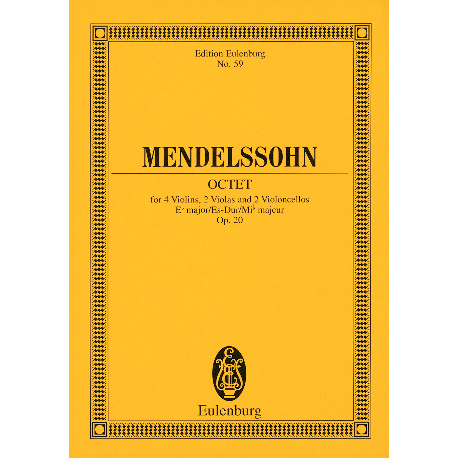 Mendelssohn's brilliant, youthful String Octet in E-flat Major, Op.20 for four violins, two violas, and two cellos is the most significant work of its kind and one of the composer's most beloved works. Beautiful lyricism and infectious energy meld with glimmers of the supernatural in the fairy-like scherzo, culminating in the finale, a contrapuntal tour-de-force based on a melodic fragment from Handel's ''Hallelujah Chorus''. Miniature study score only.