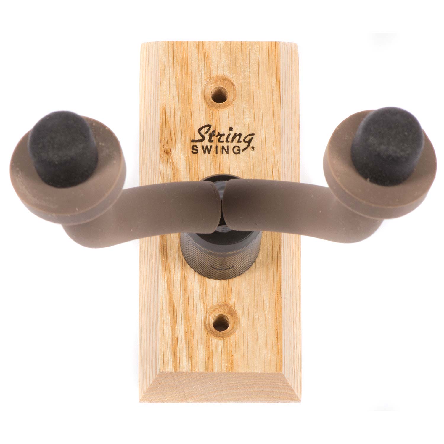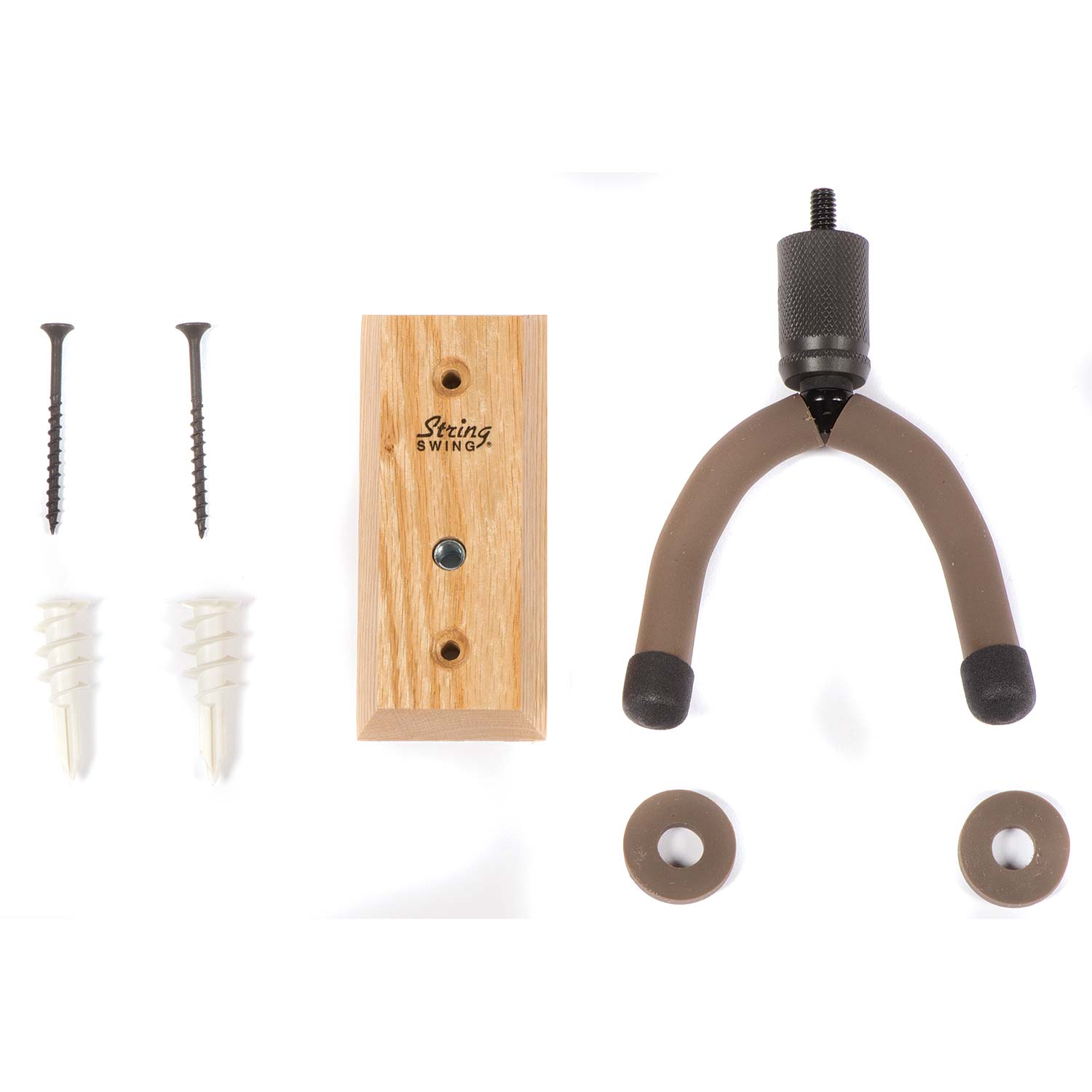This clever hanger is designed to fit acoustic, electric, and classical guitars with ease. It has a light finished base and has all the hardware needed to mounti it to a flatwall surface i.e. drywall, wood, etc. Your instrument does not rest on the tuners. Keeper rings are included with this hanger.
