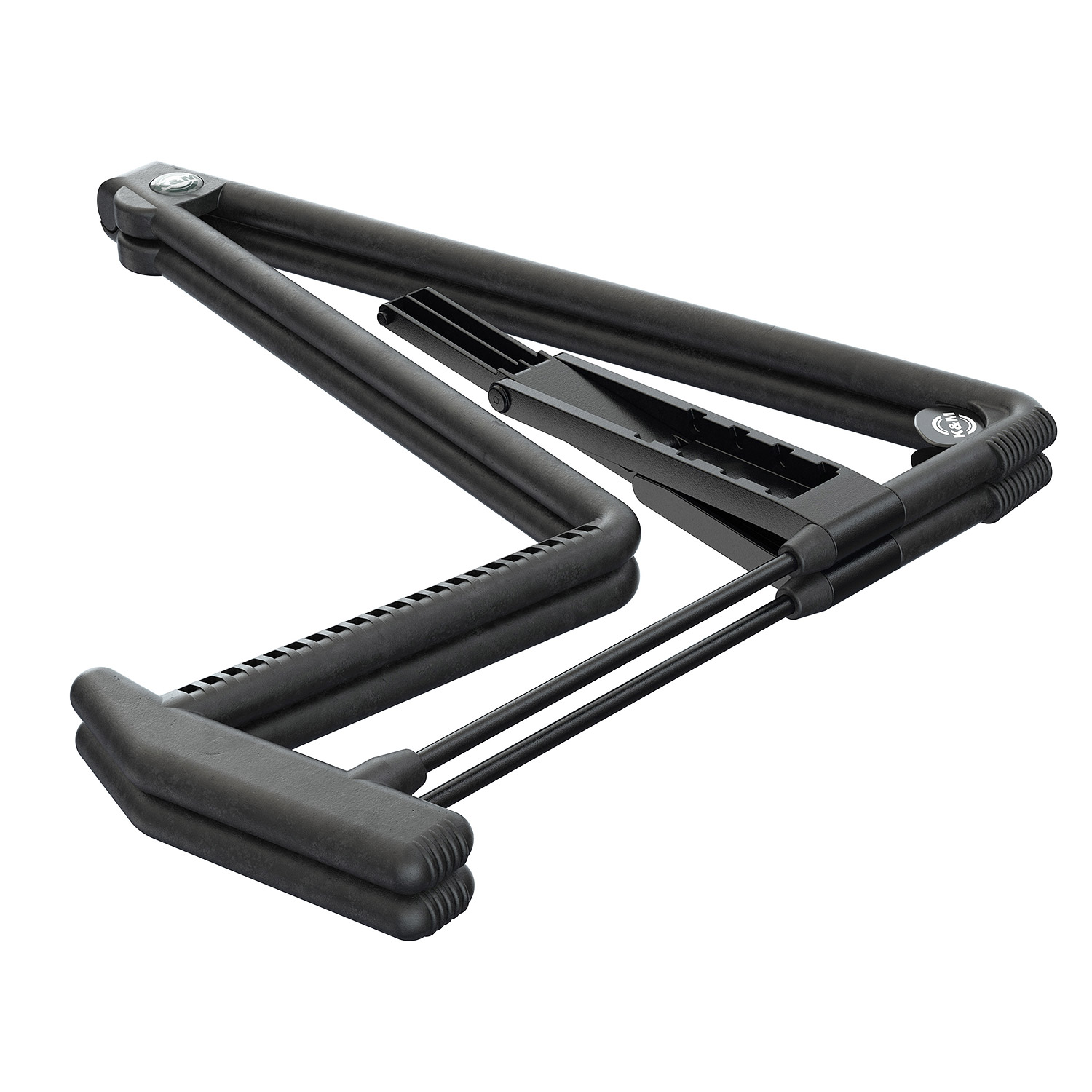 Worldwide proven guitar stand. The instrument is particularly well cared for thanks to the elaborate new rubber structure. With the innovative adjustable cross bar, guitars of different sizes or even other instruments such as a cello or French horn can be placed on the stand. For storage and transport the stand folds flat. In addition, we provide a practical transport lock. An additional feature includes integrated guitar pick holders.