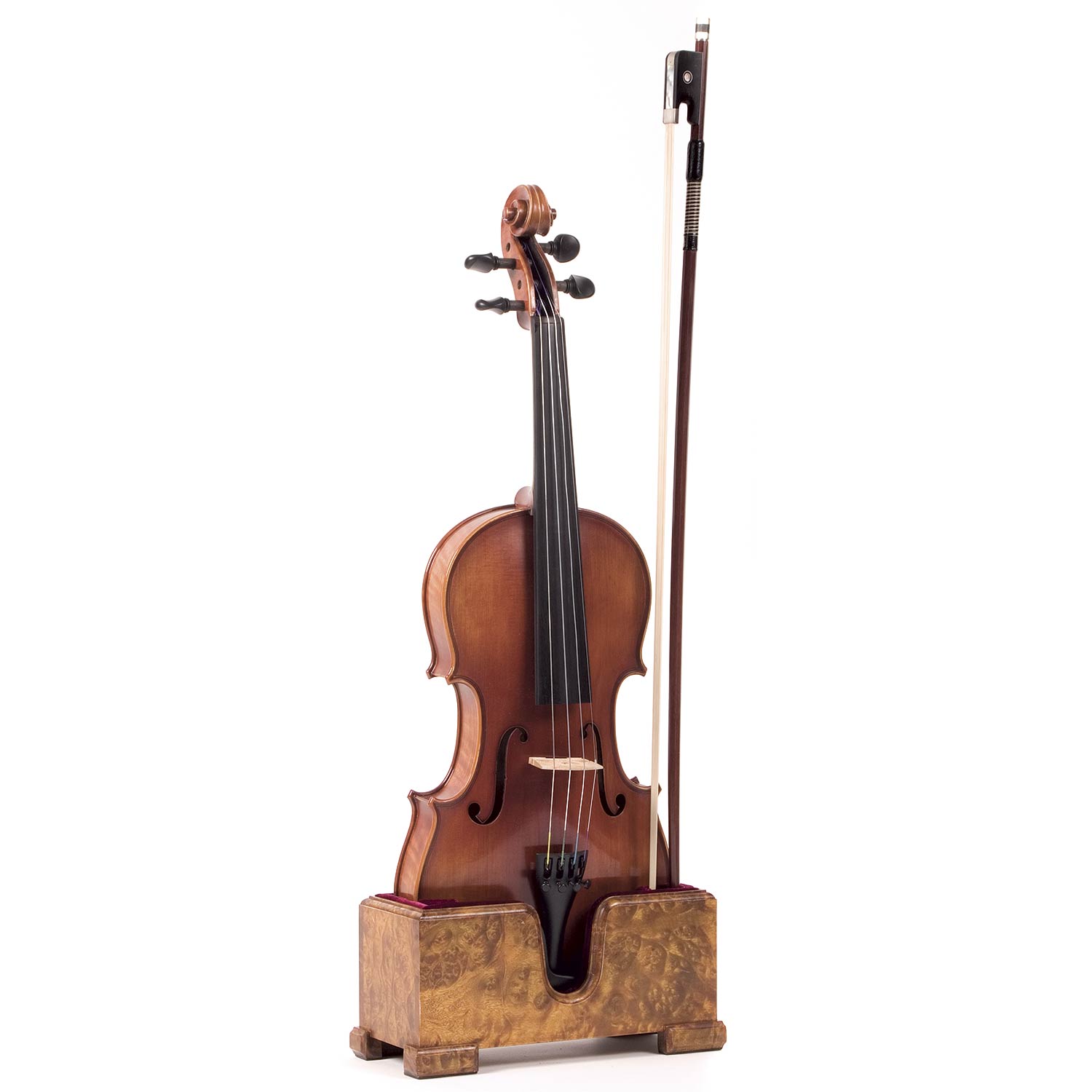 The Master 4/4 Violin Cradle is made with curly bird's eye maple with a deep, rich varnish. This wonderful cradle will safely hold your 4/4 violin and bow. It has a beautiful suede wine interior.
