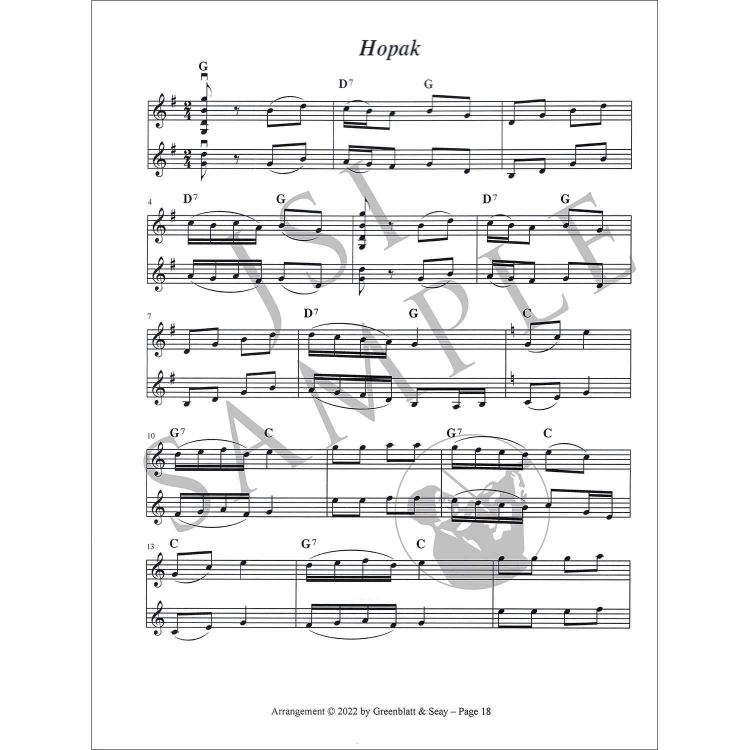 Welcome to Ukrainian Fiddle Tunes for Two, a collection of 35 traditional tunes from the land of blue skies and fields of wheat. These captivating pieces are presented in score form with the melody on the top line and the harmony on the bottom, so you can play the melody by yourself, or add the harmony when you have another musician handy. All tunes are key compatible with viola and cello versions, and chords are included, just in case you happen to have a guitarist or mandolinist or pianist handy.