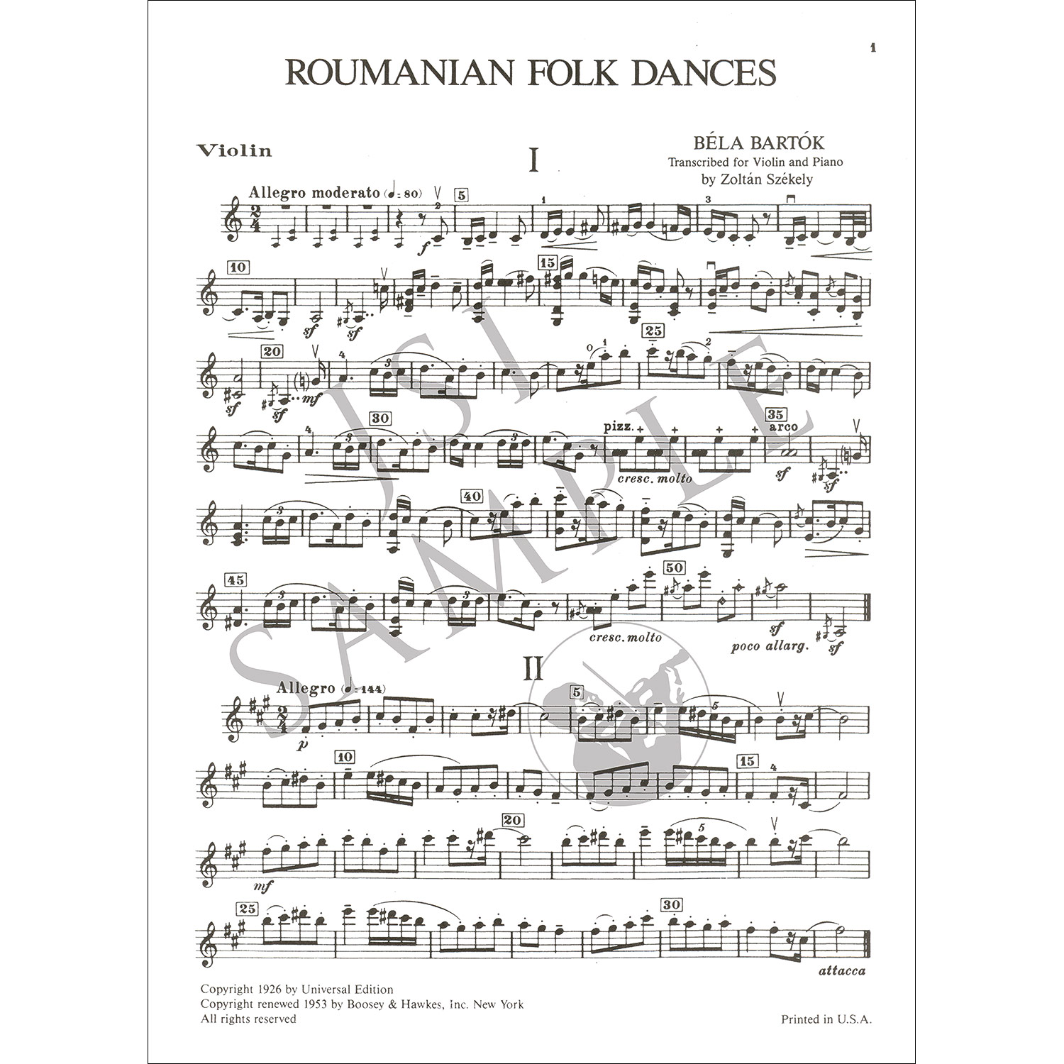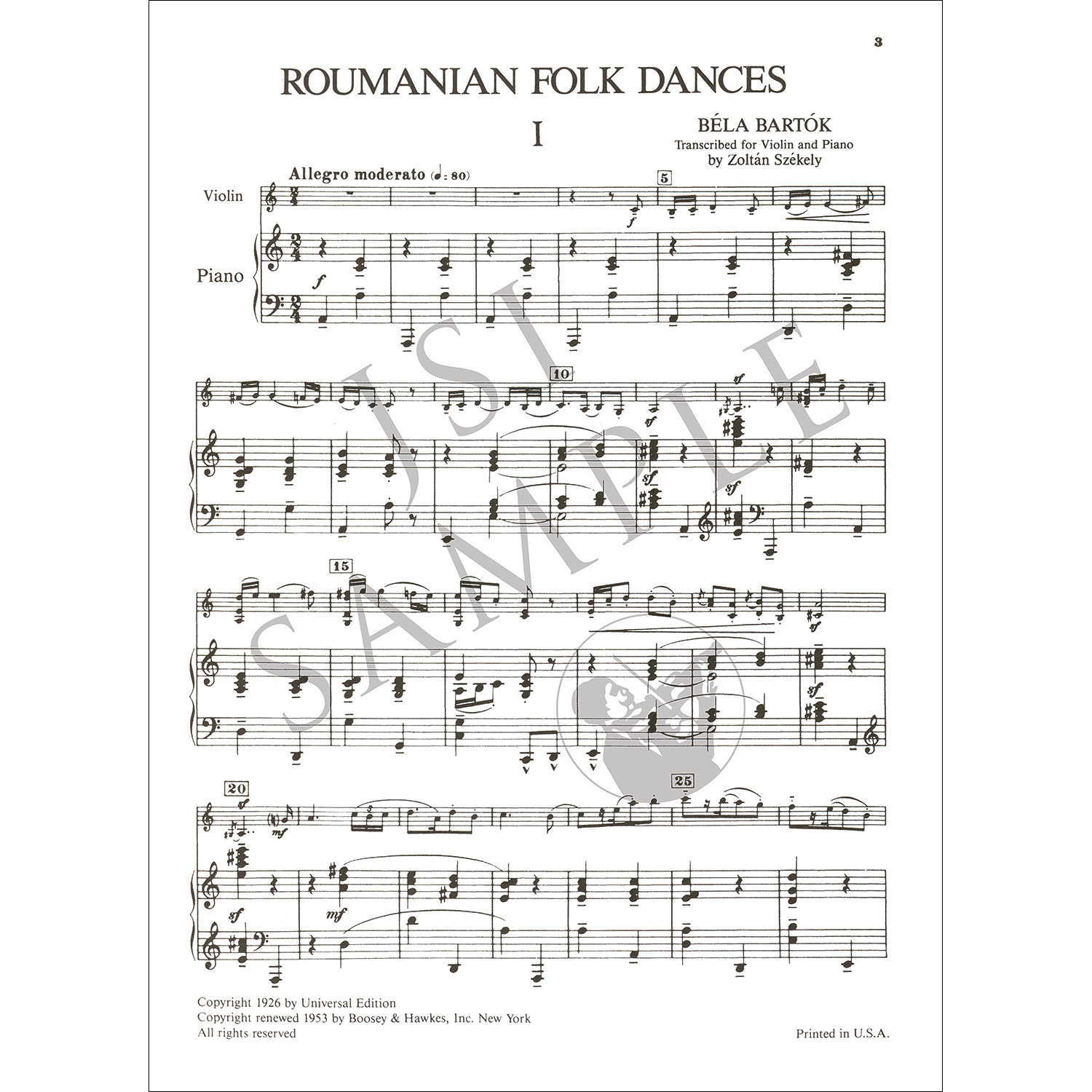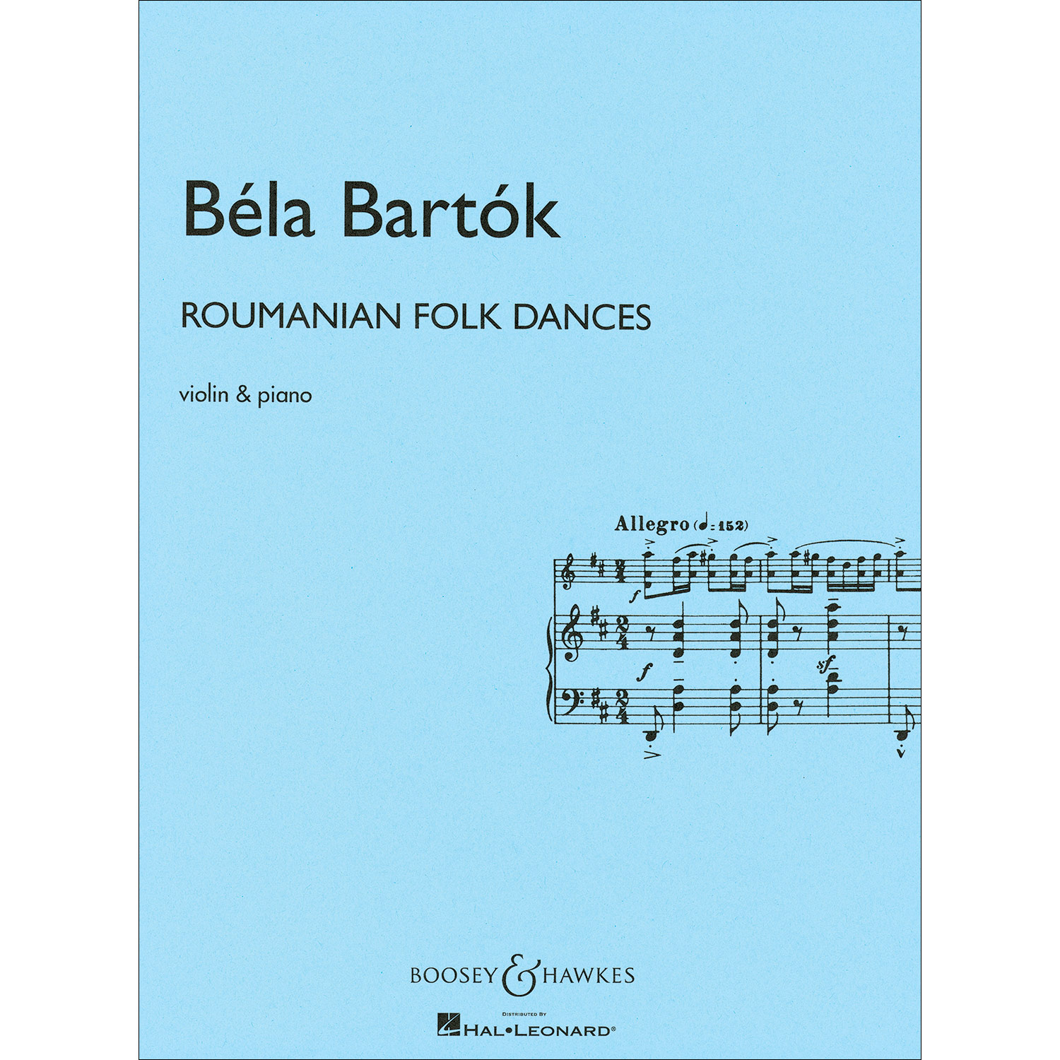 One of Bartok's most enduring works is his set of six Romanian Folk Dances, Sz. 56, based on seven Romanian dance melodies from Transylvania. He first wrote them for piano in 1915, later orchestrating them in 1917. His lively, immediate, and above all, authentic recompositions of these tunes proved so popular that the great violinist Zoltan Szekely arranged and adapted it into this showpiece for violin. Intermediate-advanced level, Grade 4.